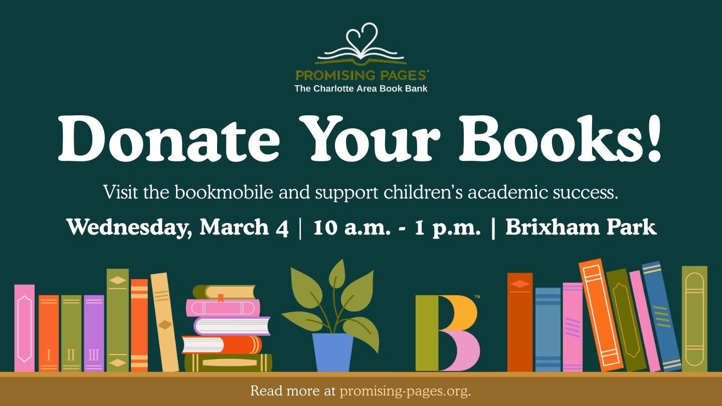 Promising Pages will be on-site at the Ballantyne Farmers Market on Wednesday, March 4, accepting new and gently used children's books from baby to high school reading levels. Their Bookmobile will also be on-site!